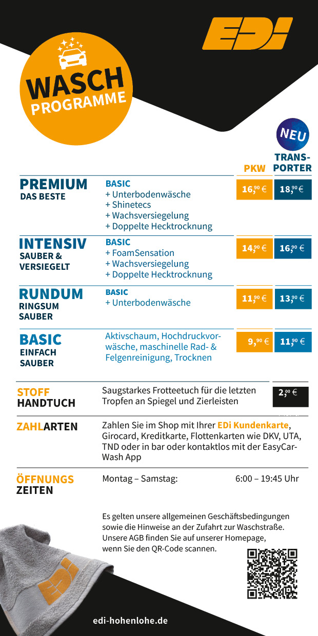 Waschpreise Tankpunkt Öhringen 1 (Stand 07/2025)